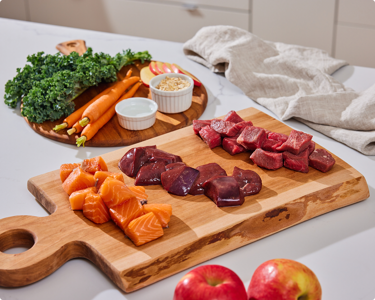 Certified Humane grass-fed beef & beef liver, Ocean Wise recommended wild-caught salmon, non-GMO kale, apples, butternut squash
